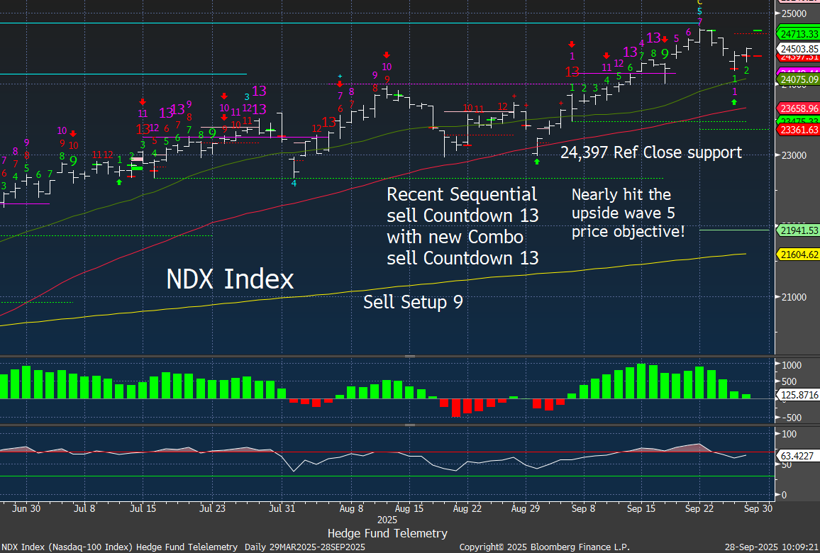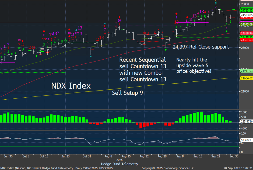 The Nasdaq 100 Index also has a price flip down with Setup on day 2 of 9 after recently nearly hitting the wave 5 upside price objective. The Reference Close ticked up and remains first support – needs to close under.
