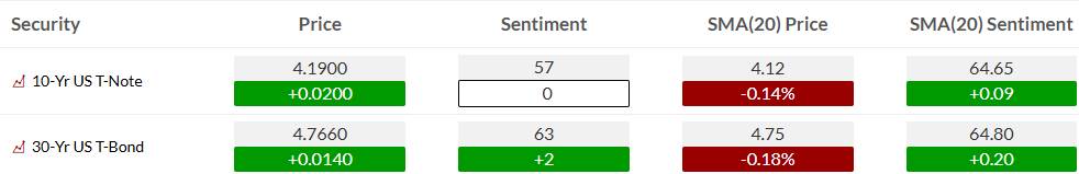 Bond bullish sentiment has shown very little movement over the last week, remaining around the ~60% level.
