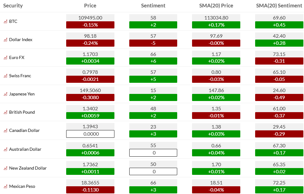 Currency bullish sentiment, with US Dollar bullish sentiment, saw the US Dollar sentiment strong all week, with a fade on Friday.