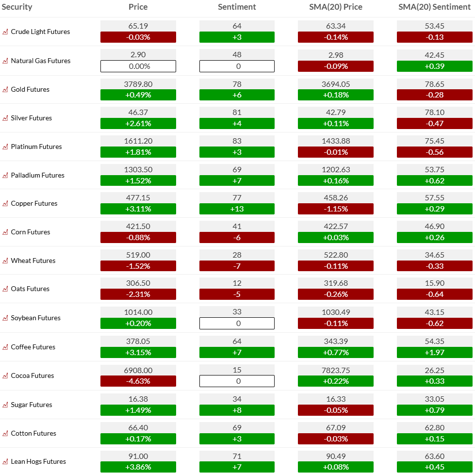 Commodity bullish sentiment highlighted with metals having a strong week with all nearly back in the extreme zone.