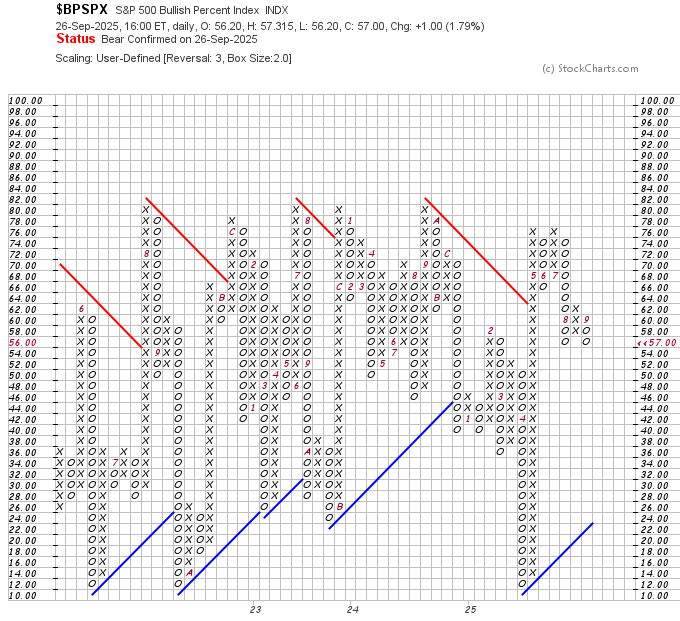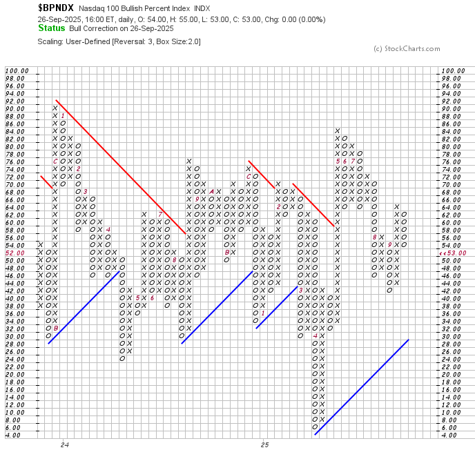 Nasdaq 100 bullish percent index is in a column of O’s. This is a negative column and breaking 50% would add to conviction of a further decline.