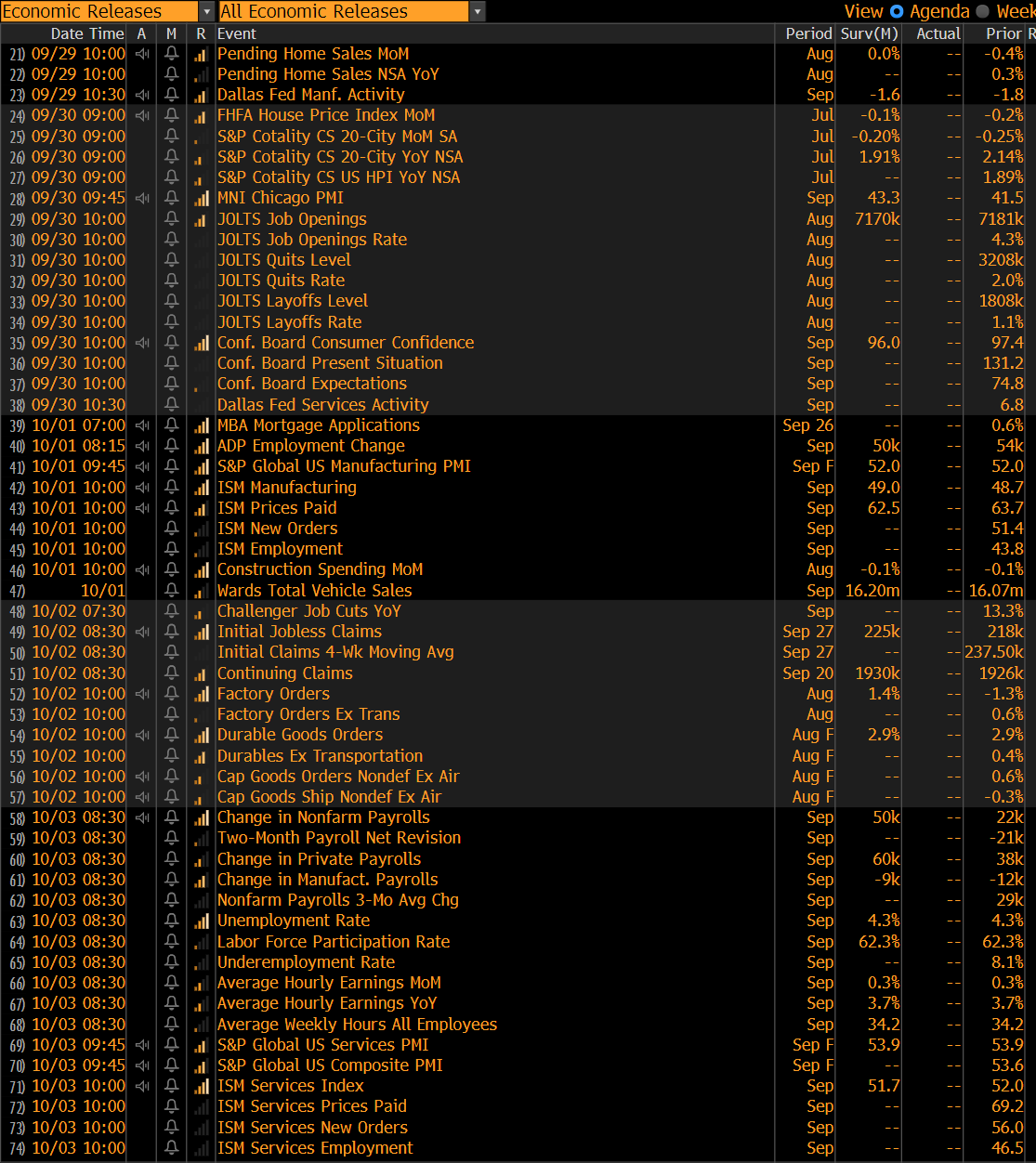 The week ahead has some important economic data points including China’s NBS PMIs for September on Monday night, France/Germany’s CPIs for September on Tuesday morning, US home prices for July, the US JOLTs report for August on Tuesday, the Eurozone CPI for September early Wednesday morning, the ADP jobs report for September on Wednesday with consensus modeling +50K vs. +54K in August, the US manufacturing ISM for September on Wednesday with consensus expecting 49.2, up from 48.7 in August, the US jobs report for September with consensus expecting +50K, up from +22K in August, and the US services ISM for September with consensus expecting 52, flat vs. August. US government spending authorization is set to expire on Tuesday. I expect, once again, another Kabuki theater last-minute resolution.