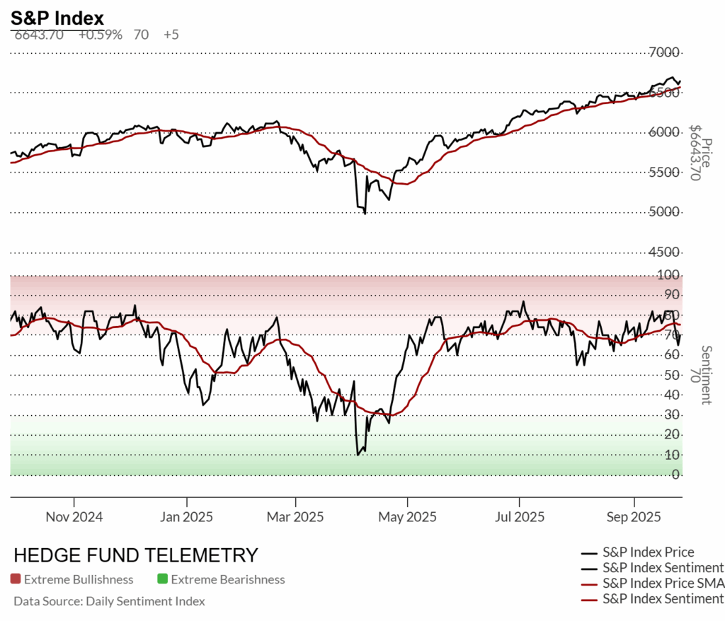 Equity bullish sentiment dropped all week and bounced on Friday, holding the elevated zone >70%. Breaking the lows seen in August would confirm further decline ahead.