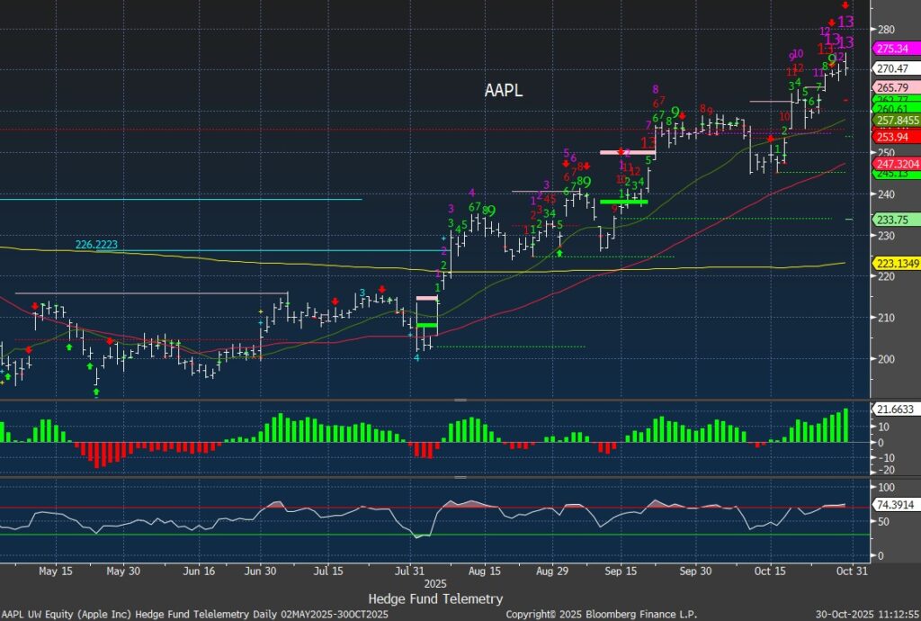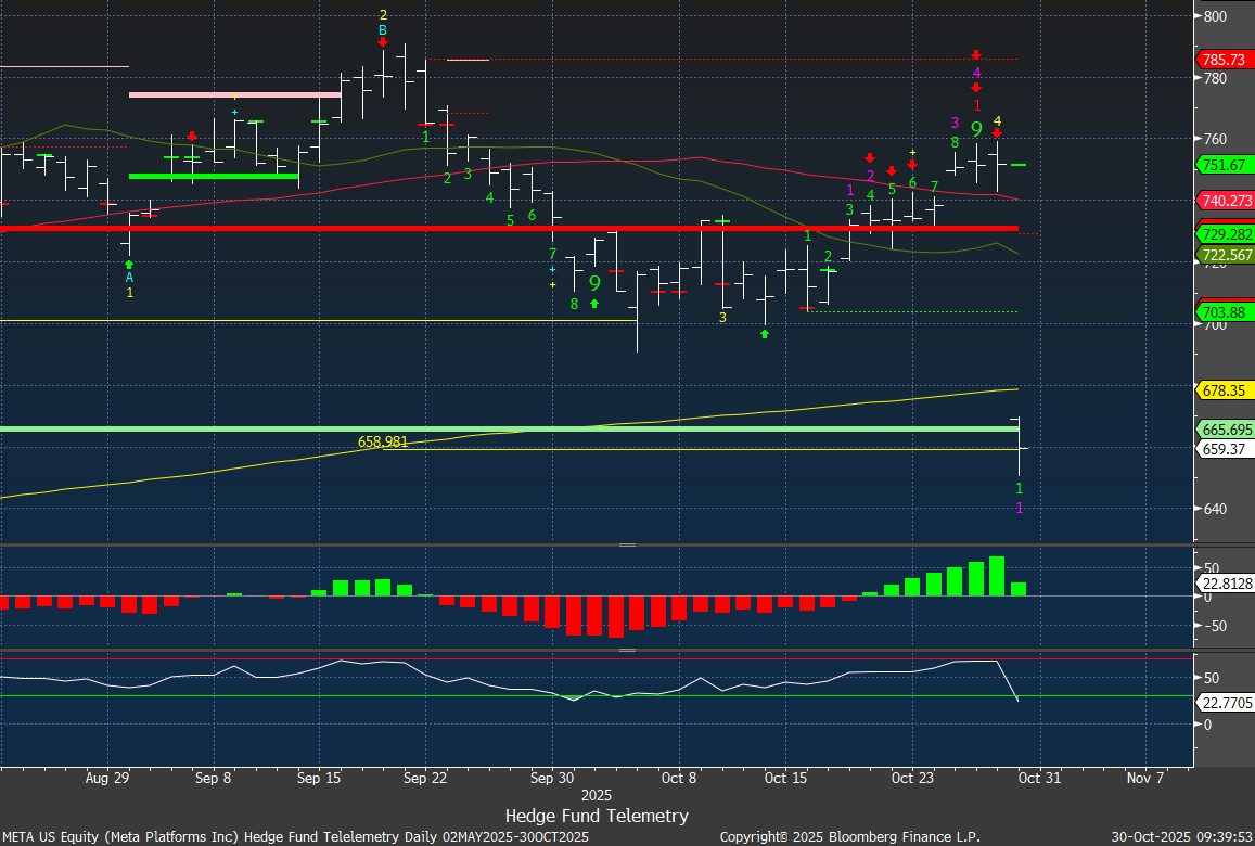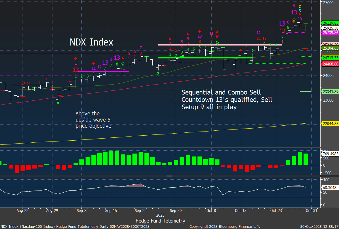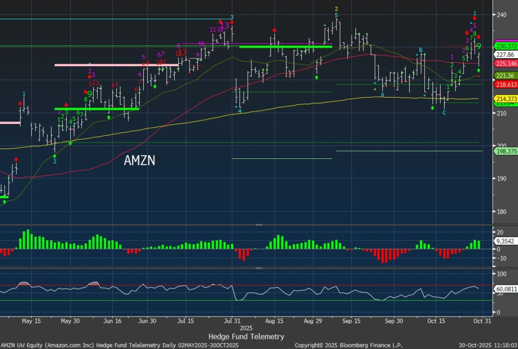 AAPL has VERY high expectations and remains a crowded long. Positive iPhone early sales stories have been out there along with lead times dropping a moderate negative. It’s trading at 37x earnings which for Apple is about as good as it ever gets historically. It’s overbought and has a cluster of sell Countdown 13’s. I’ll hold the remaining reduced position and hold off from options as it typically doesn’t move much the day after earnings.