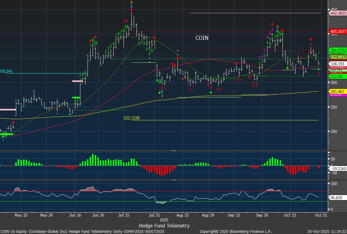 COIN was a recent short that was covered with a gain. It now is more in no man’s land holding the 300 support and has a pending upside Sequential so I’ll hold off on doing anything with it. If crypto breaks then it might be a better time to short.