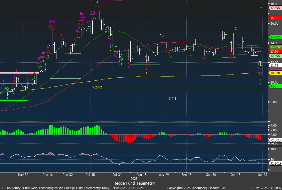 PCT will report earnings/company update on November 6th. I sold 90% of my long position at the highs, locking in a huge 125% gain with the 13’s. I plan to buy back lower, and in doing so, I am watching for a re-entry level. 11ish is the 200-day, and possibly 9.29 is the downside wave three price objective. The Combo is on day 10 of 13 and needs further downside to qualify the 13.
