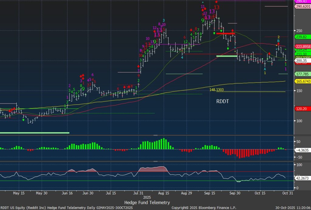 RDDT peaked with recent 13’s in upside wave 5. It’s trading at 200 near term support. A lower high wave 2 is present. I would normally press this short to try for the downside wave 3 price objective at 148 however short interest isn’t that informative and there was recent put buying which could cause a squeeze. And the implied move is 15% so I’ll watch on sidelines.