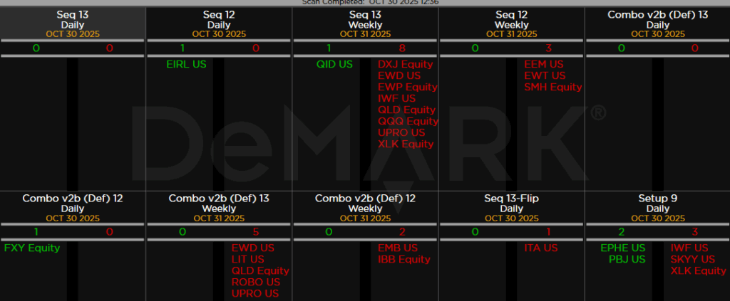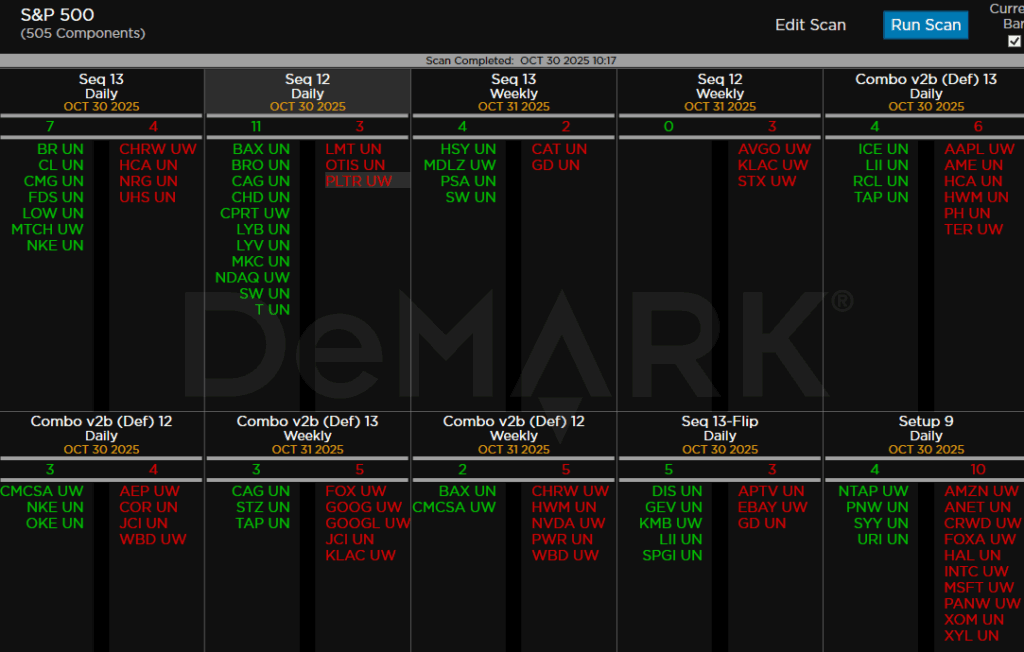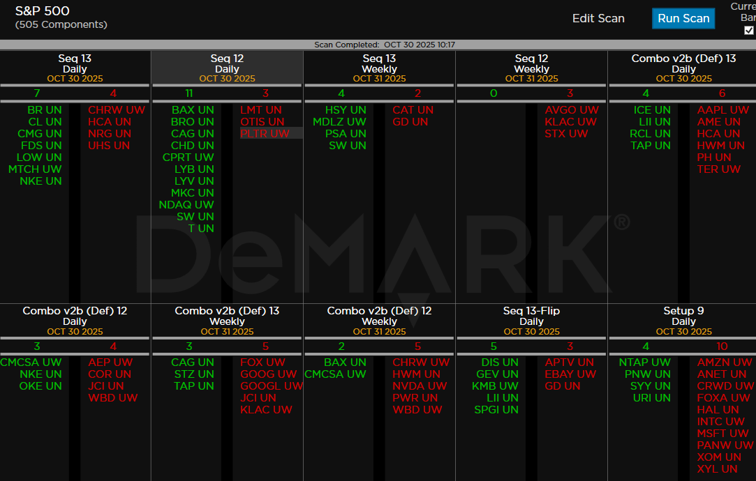 Within the S&P 500, the DeMark Sequential and Combo Countdown 13s and 12/13s on daily and weekly periods. Green = buy Setups/Countdowns, Red = sell Setups/Countdowns. Price flips are helpful to see reversals up (green) and down (red) for idea generation. The extra letters at the end of the symbols are just a Bloomberg thing. Worth noting: Look more buy signals vs sell signals! And the S&P hit a new all time high yesterday. To see more buy signals vs sells after hitting an all time high is unique however a lot of been declining in sectors out of favor
