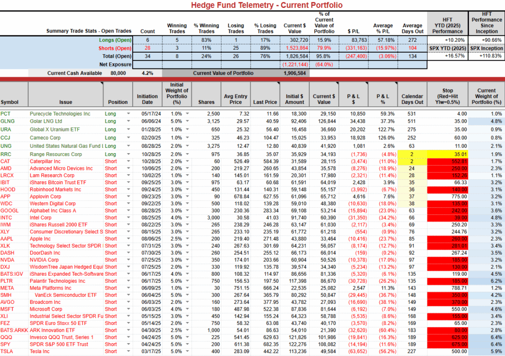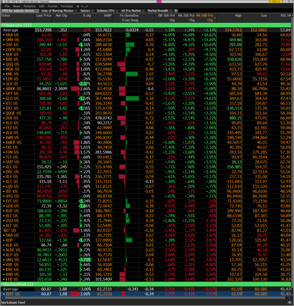 The PPO monitor (percentage price oscillator) force ranks ETFs by percentage above/below the 50-day moving average. This monitor and others are offered to Hedge Fund Telemetry subscribers on Bloomberg. Mixed day with tech weak