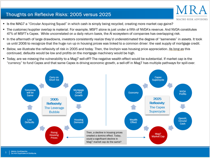 I’ve discussed the risk of narrow concentration, leverage, and complacency plenty of times within the Mag 7. The dependence on this to keep partying like 1999 long into the night matters. It’s different from the tech bubble, and some will say today’s leaders make a lot of money and are not overvalued like 1999. They are all trading at elevated multiples individually, with multiple expansion requiring more E in the PE equation. The risk is nicely laid out by my friend Dean Curnutt, founder of Macro Risk Advisors. He compares the housing bubble dependence on rising house prices with the rising Mag 7 market cap. Dean is one of the better strategists – focused on derivatives. If you don’t have coverage there, let me know, and I can hook you up. I think this analysis is “awesome” and a “12.” Thank you, Dean, for allowing me to share this!