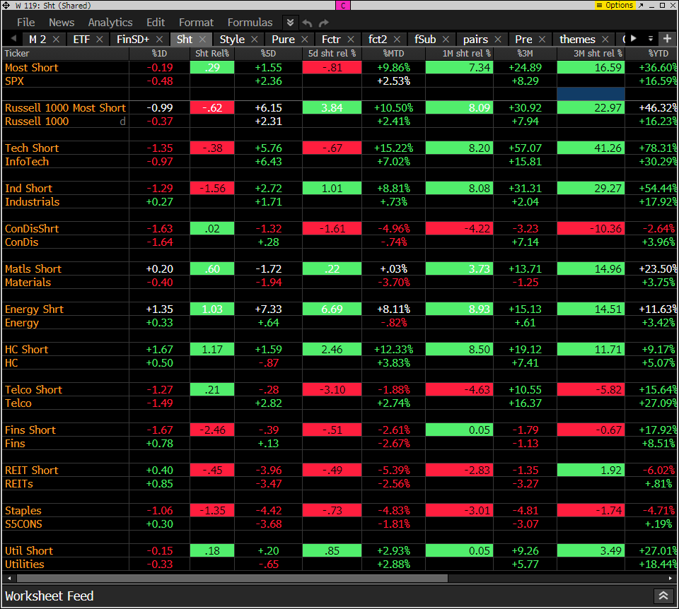 This monitor has the S&P indexes and the Goldman Sachs most shorted baskets. Short baskets are mixed.