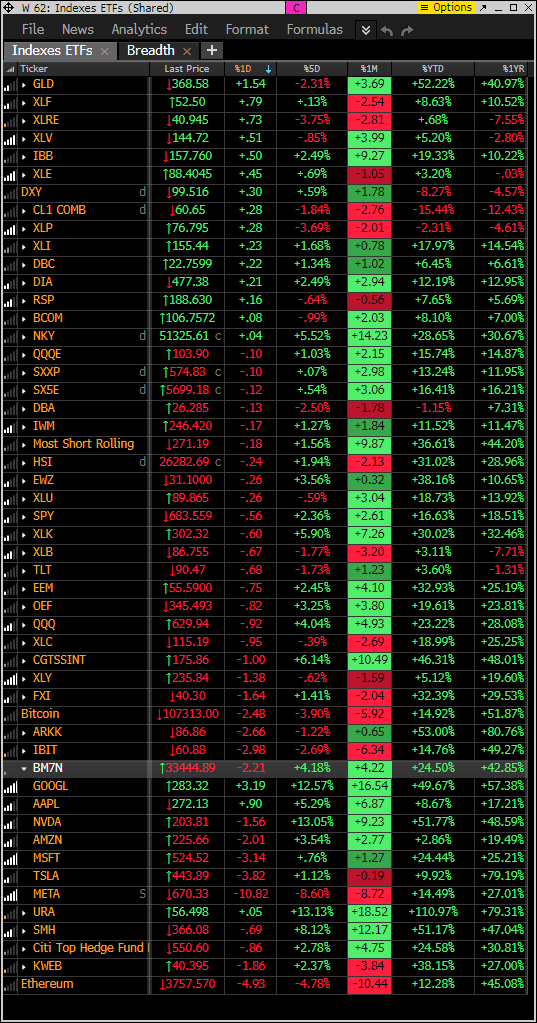 ETF with today’s performance with 5-day, 1-month, and 1-year rolling performance YTD. Gold back to the top along with some defensive sectors with risk on sectors weak on the day.
