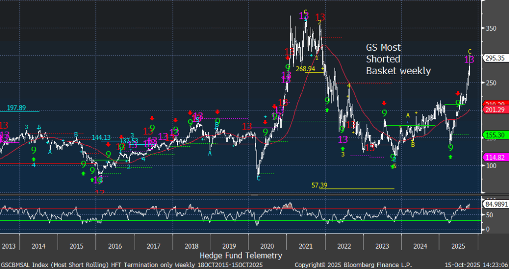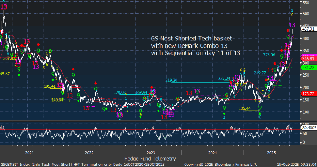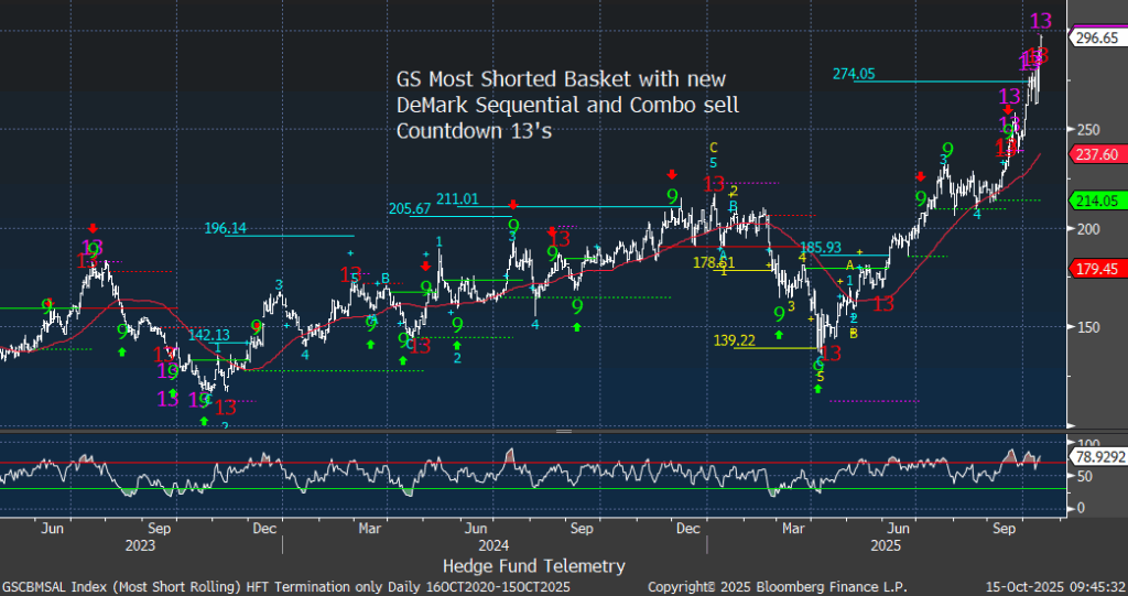 GS Most Shorted Basket has both daily and weekly DeMark exhaustion sell signals. As a reminder, back in April, there were exhaustion buy signals.