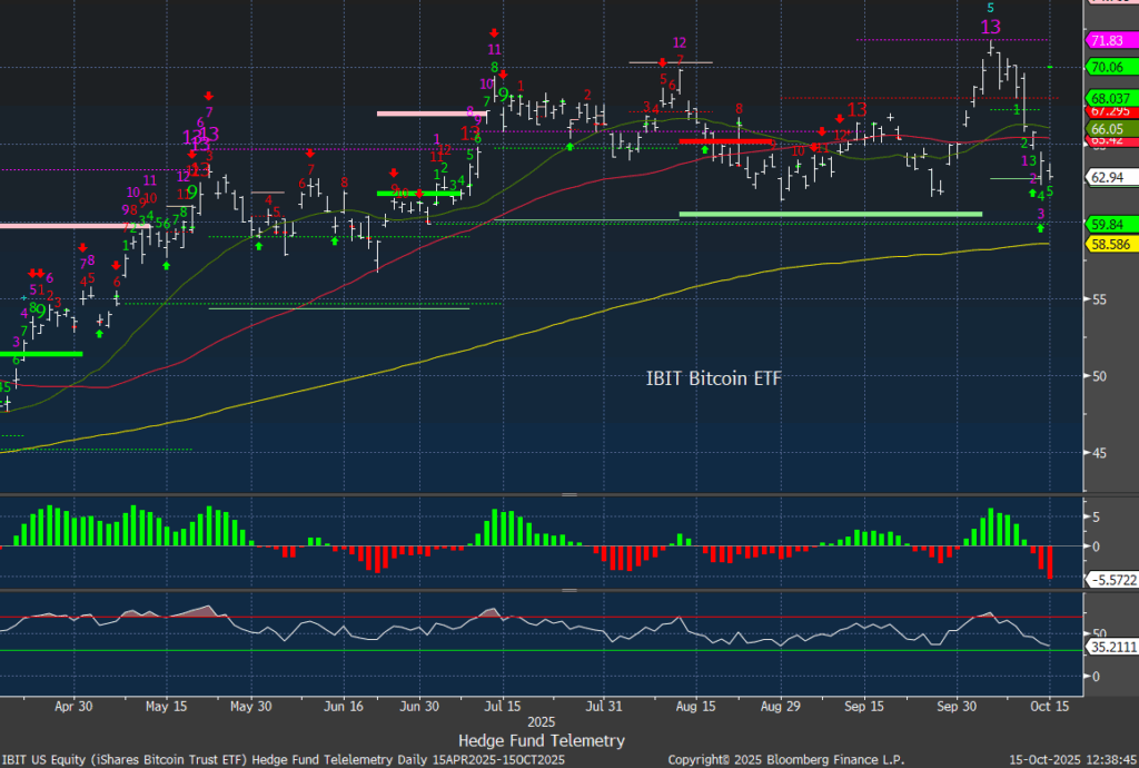 The IBIT Bitcoin ETF is nearing support again, and I remain short. It is still actionable, as I see a trapped long environment.