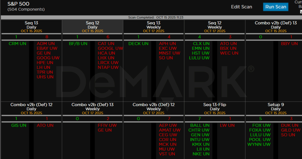 Within the S&P 500, the DeMark Sequential and Combo Countdown 13s and 12/13s on daily and weekly periods. Green = buy Setups/Countdowns, Red = sell Setups/Countdowns. Price flips are helpful to see reversals up (green) and down (red) for idea generation. The extra letters at the end of the symbols are just a Bloomberg thing. Worth noting: With the lift today more sell Countdown 13’s are developoing including EBAY, GE, GOOGL, HPE, CAT, LRCX, BBY