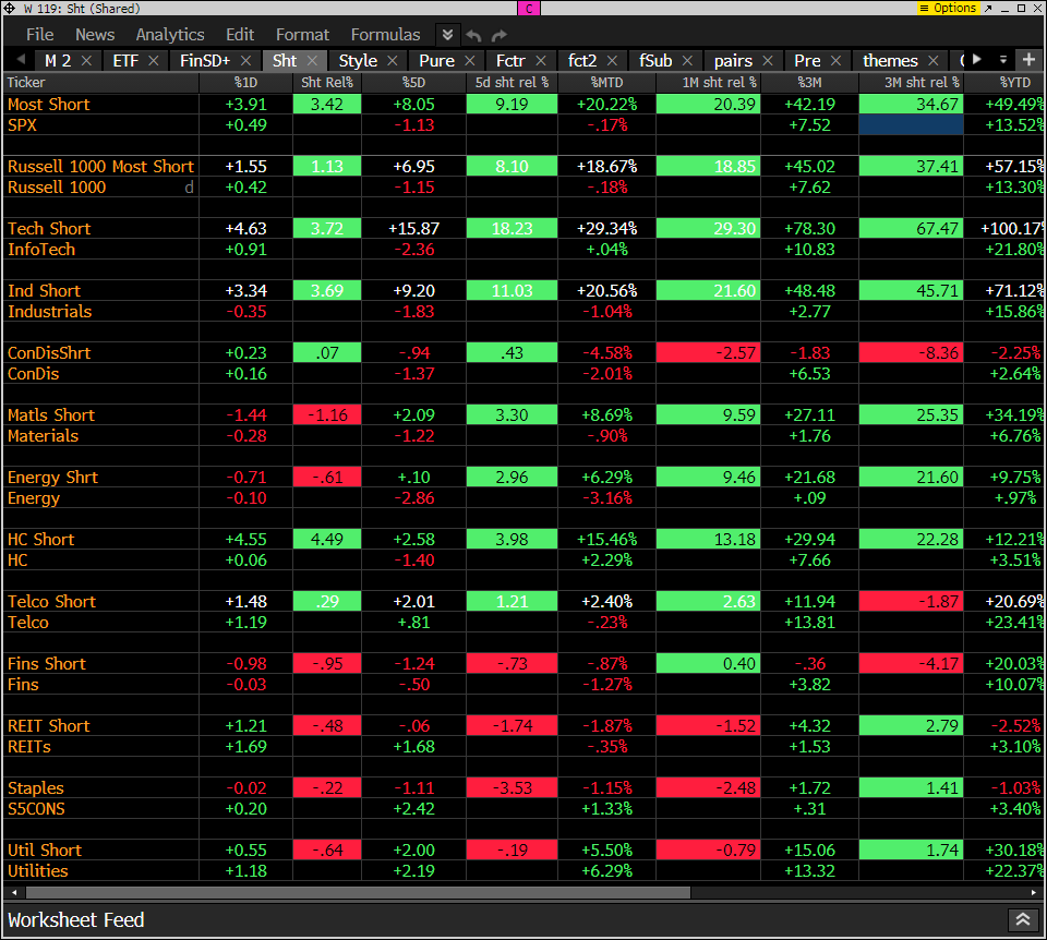 This monitor has the S&P indexes and the Goldman Sachs most shorted baskets. Mixed action with overall more squeezing