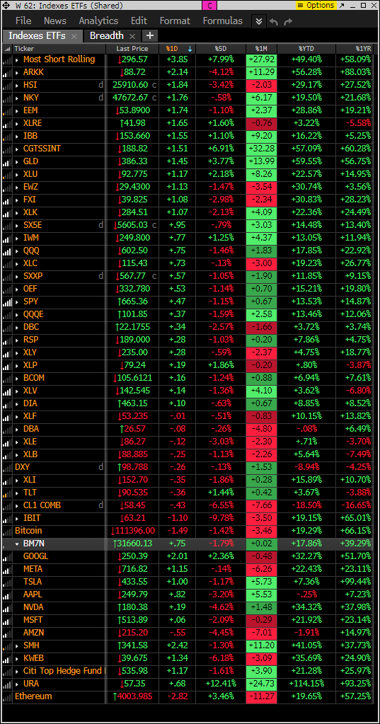 ETF with today’s performance with 5-day, 1-month, and 1-year rolling performance YTD. GS Most Shorted basket leading along with the unprofitable tech ETF ARKK. The 5-day action has more down in the last 5 days