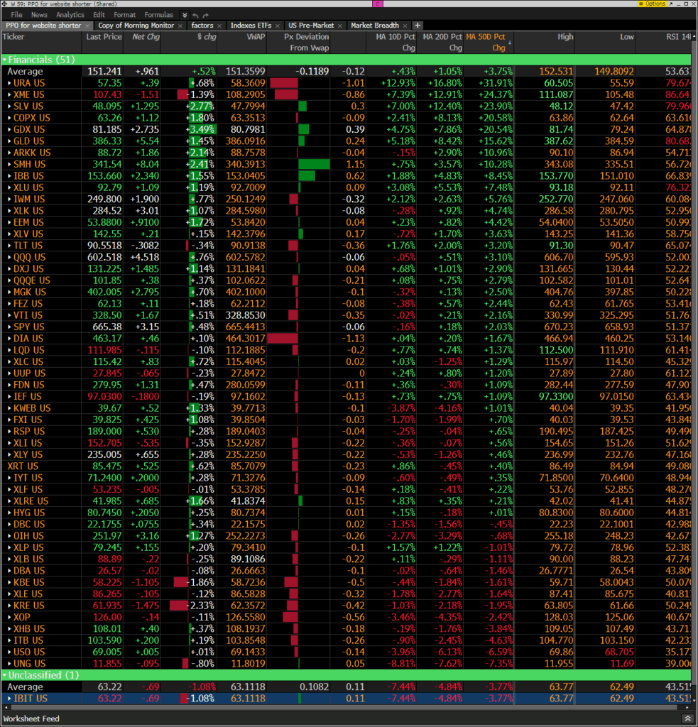 The PPO monitor (percentage price oscillator) force ranks ETFs by percentage above/below the 50-day moving average. This monitor and others are offered to Hedge Fund Telemetry subscribers on Bloomberg. Mostly green today with notable weakness with financials XLF, KBE, KRE