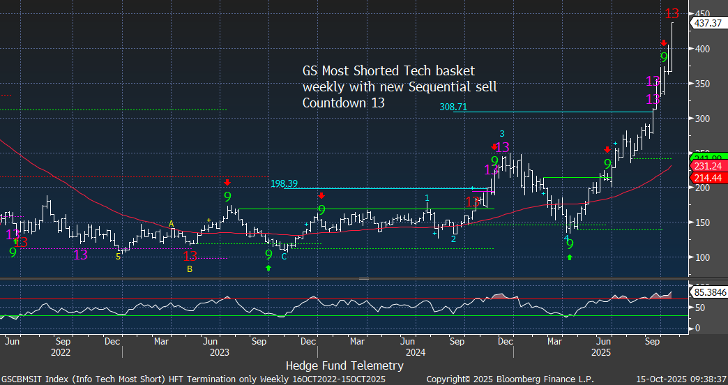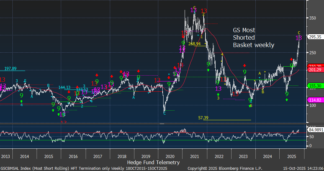 GS Most Shorted Basket has both daily and weekly DeMark exhaustion sell signals. As a reminder, back in April, there were exhaustion buy signals.