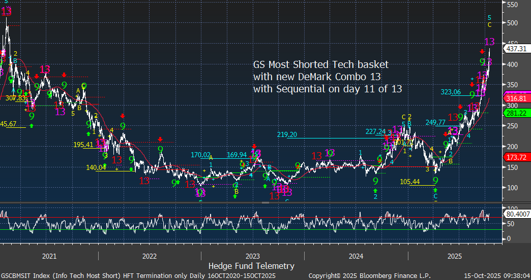Leading the charge has been the GS most shorted Technology basket. Up YTD nearly 100% vs the S&P tech sector up 20%. The daily has had several signals on the way up with short-lived dips. When I see this type of action, I’ll look at the weekly also in upside wave 5 of 5 with a new Sequential sell Countdown 13 following recent Combo 13’s. Some people have tried to tell me this is not a blow-off top or bubble… yet. I’d say those looking to buy now are in for a shocking surprise.