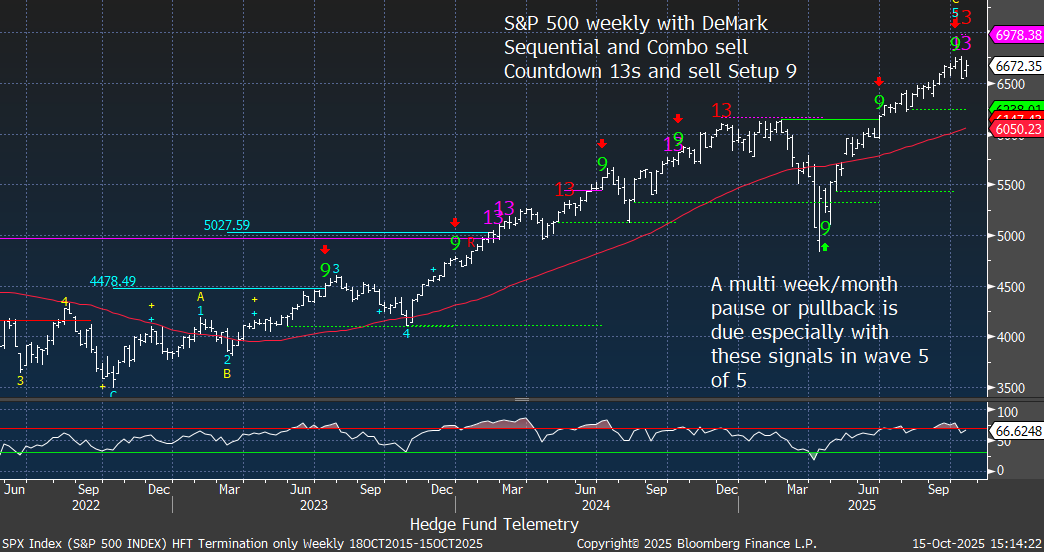 S&P weekly with DeMark Sequential and Combo sell Countdown 13’s and sell Setup 9. TDST Setup Trend support at 6238
