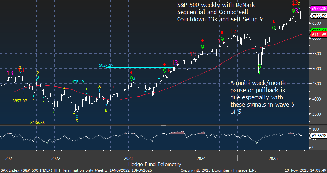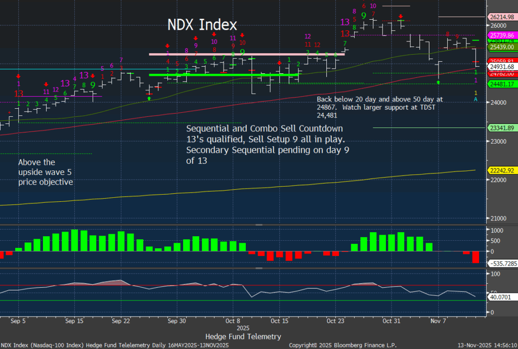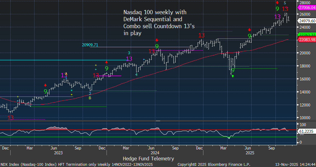 Nasdaq 100 Index daily and weekly charts with DeMark exhaustion signals remaining in play. Follow-through has been so elusive, so this needs to be watched tomorrow and Friday.