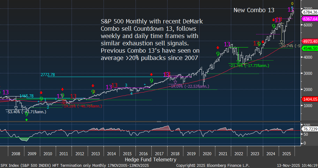 S&P 500 Index daily, weekly and monthly all have DeMark exhaustion sell signals in play. Getting follow-through on the downside with the daily has been elusive, so watch tomorrow and Friday. Breaking the recent weekly low bar would also provide some confirmation.