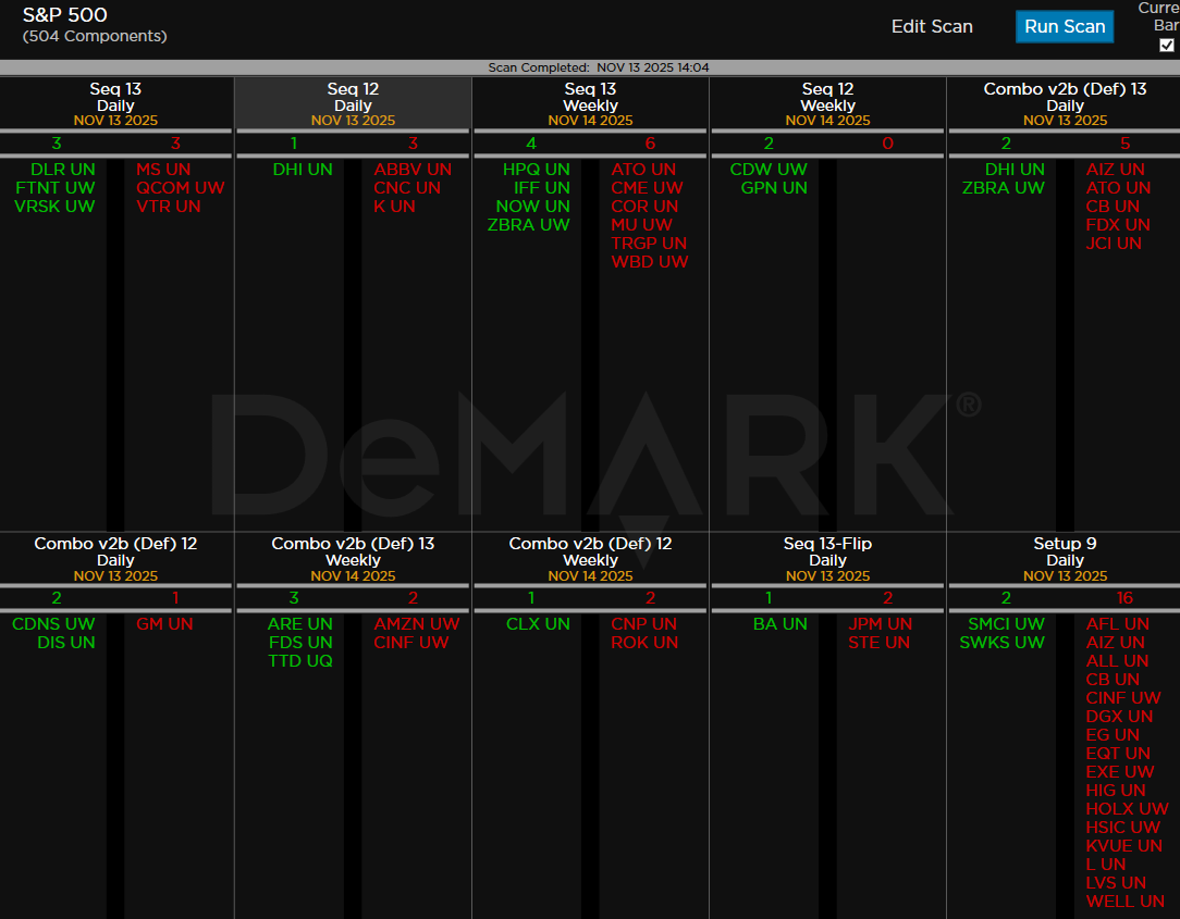 Within the S&P 500, the DeMark Sequential and Combo Countdown 13s and 12/13s on daily and weekly periods. Green = buy Setups/Countdowns, Red = sell Setups/Countdowns. Price flips are helpful to see reversals up (green) and down (red) for idea generation. The extra letters at the end of the symbols are just a Bloomberg thing. Worth noting: