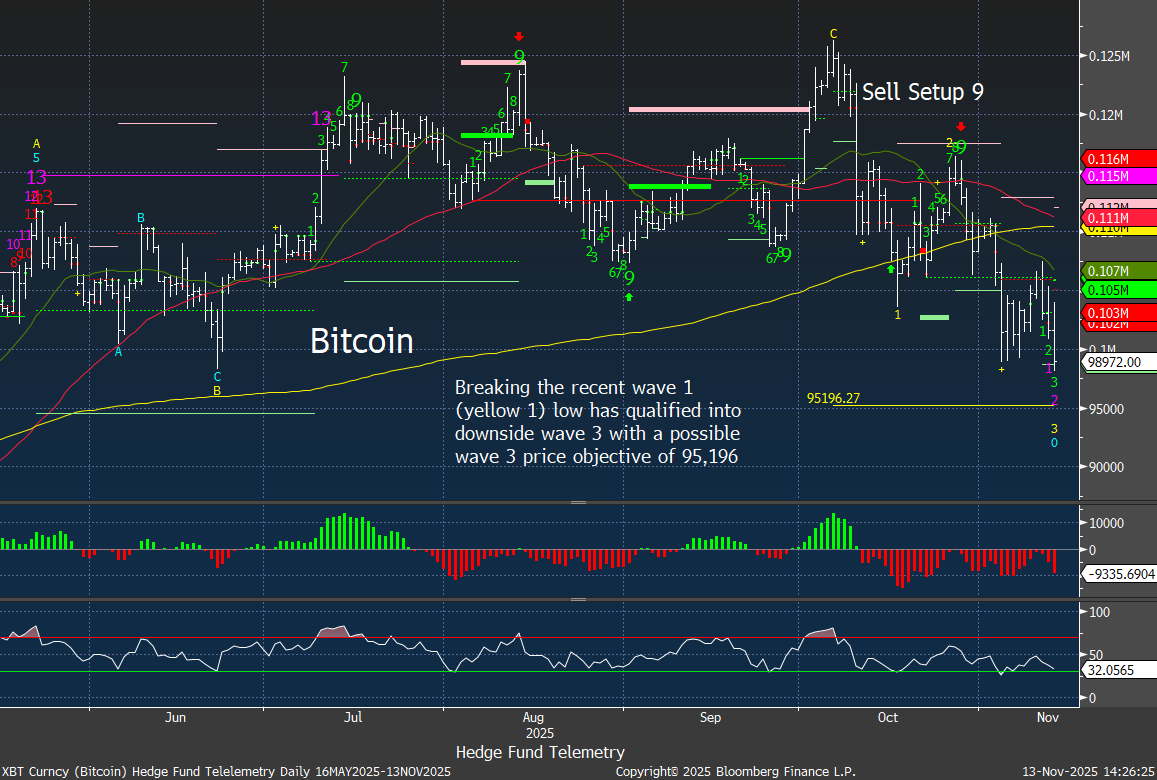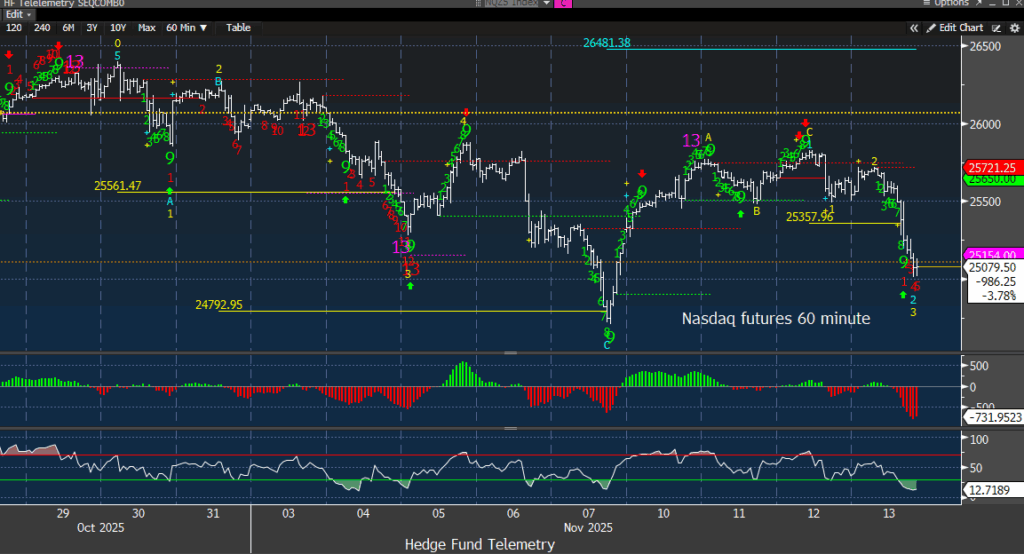 Nasdaq 100 futures 60-minute tactical time frame also with downside Sequential in progress and above the Nov 7 low.