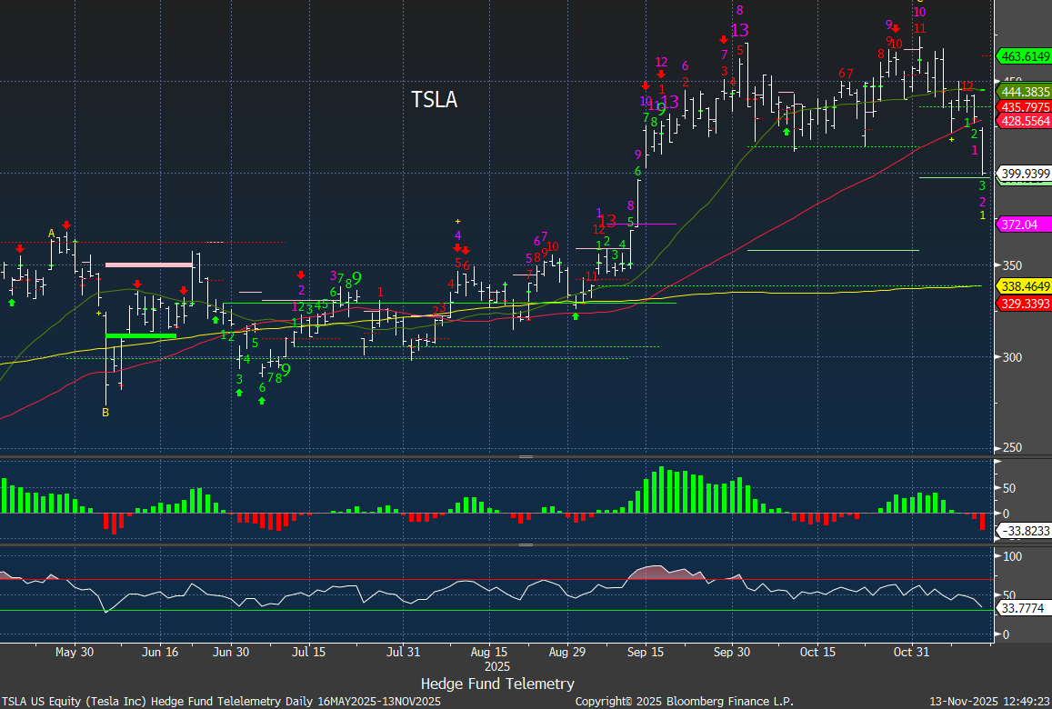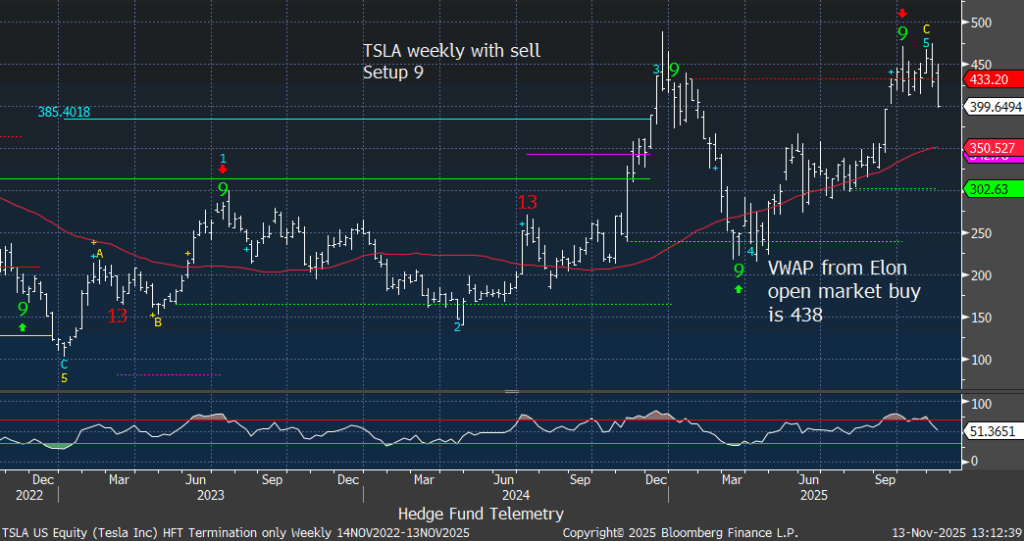 Tesla is breaking down with the VWAP from the day Elon filed his big open market buy is 438 – potential trapped buyers. That’s the solid orange line