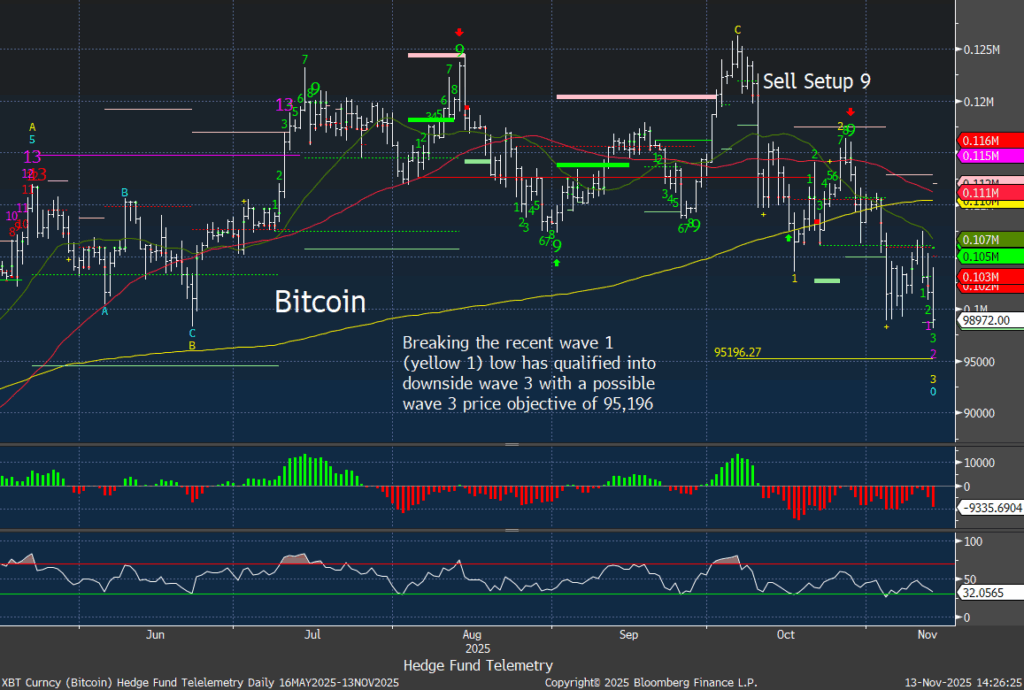 Stocks: Terrible breadth with some defensive positioning as seen recently continues – with consumer staples, healthcare, and energy. Downside followthrough has been elusive so watch tomorrow and Friday. The short term 60 minute charts have new downside Sequential Countdowns in progress but both indexes remain over the November 7th lows for now.
