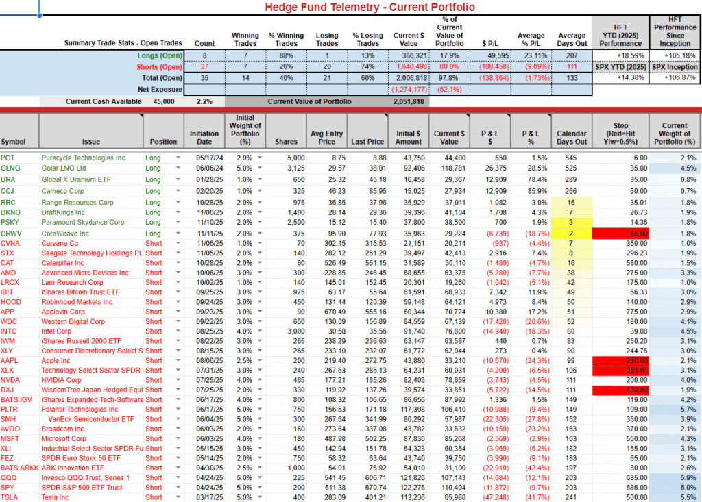 Changes: Cutting the 2% weight CRWV long. The short term SPY and QQQ momentum flipped back to sell – see below.