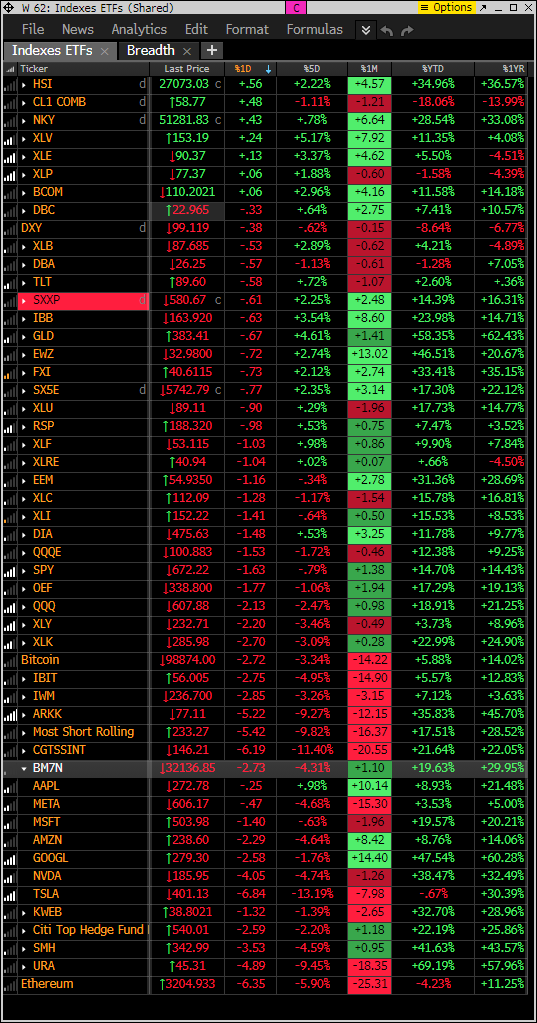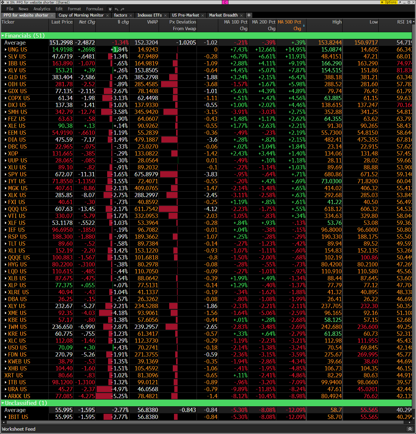 The PPO monitor (percentage price oscillator) force ranks ETFs by percentage above/below the 50-day moving average. This monitor and others are offered to Hedge Fund Telemetry subscribers on Bloomberg. Nasty day.
