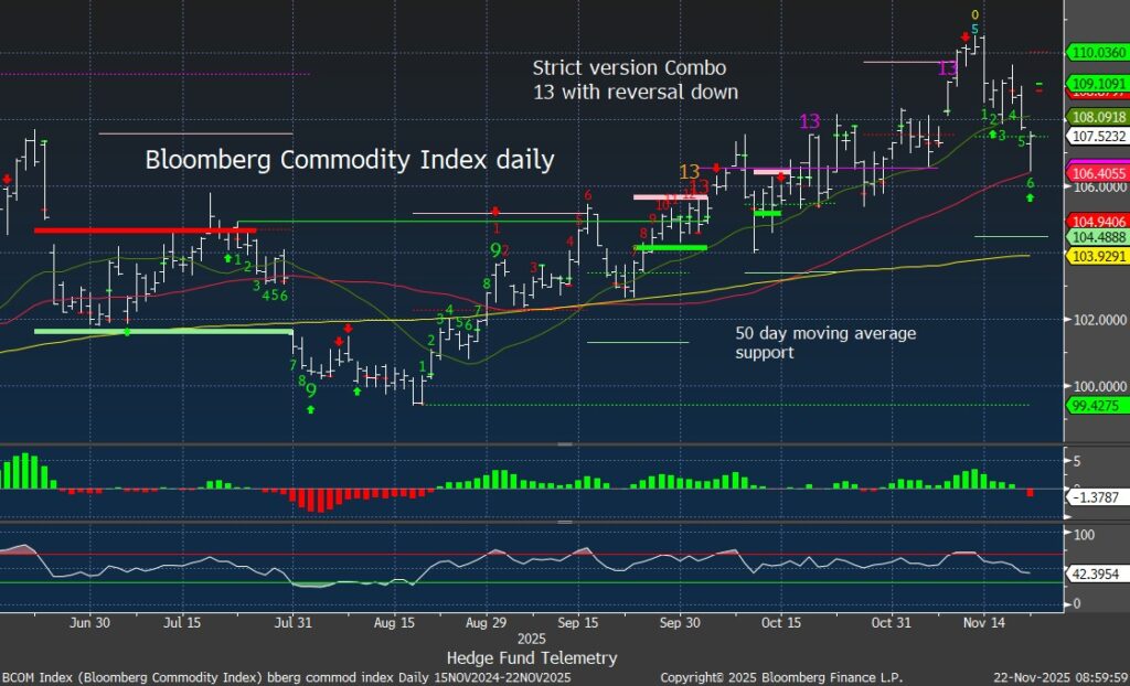 Bloomberg Commodity Index daily backing off after the strict version of the Combo 13. It tested the 50 day on Friday and closed well off and above the open