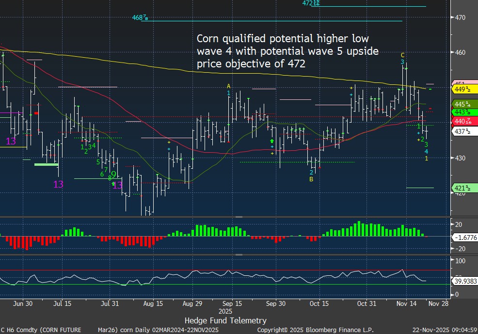 Corn futures daily with possible another higher low wave 4 corrective pullback