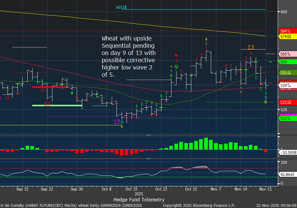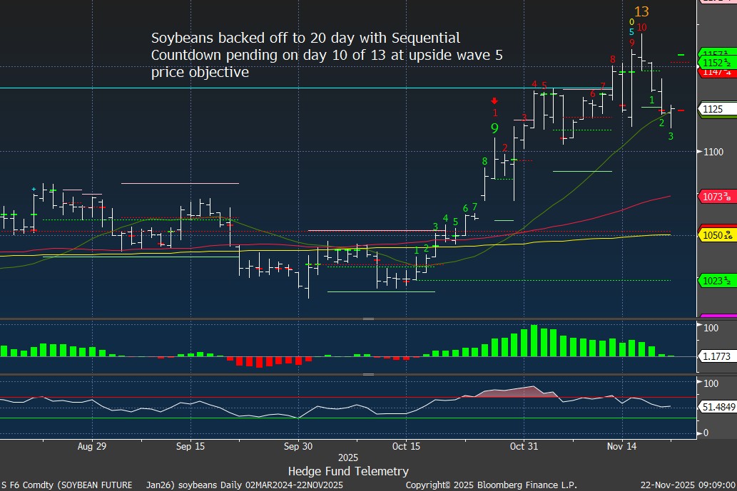 Soybean futures daily backing off from overbought levels with potential still there with Sequential in progress