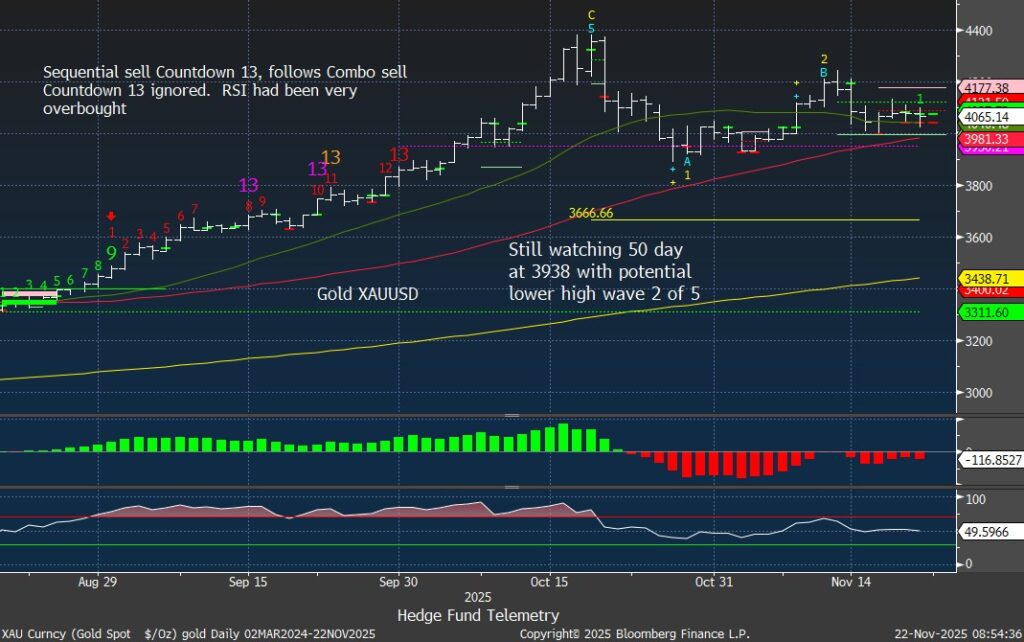 Gold daily sideways with 50 day support but might be lower high wave 2 so there is a risk of breaking into downside wave 3