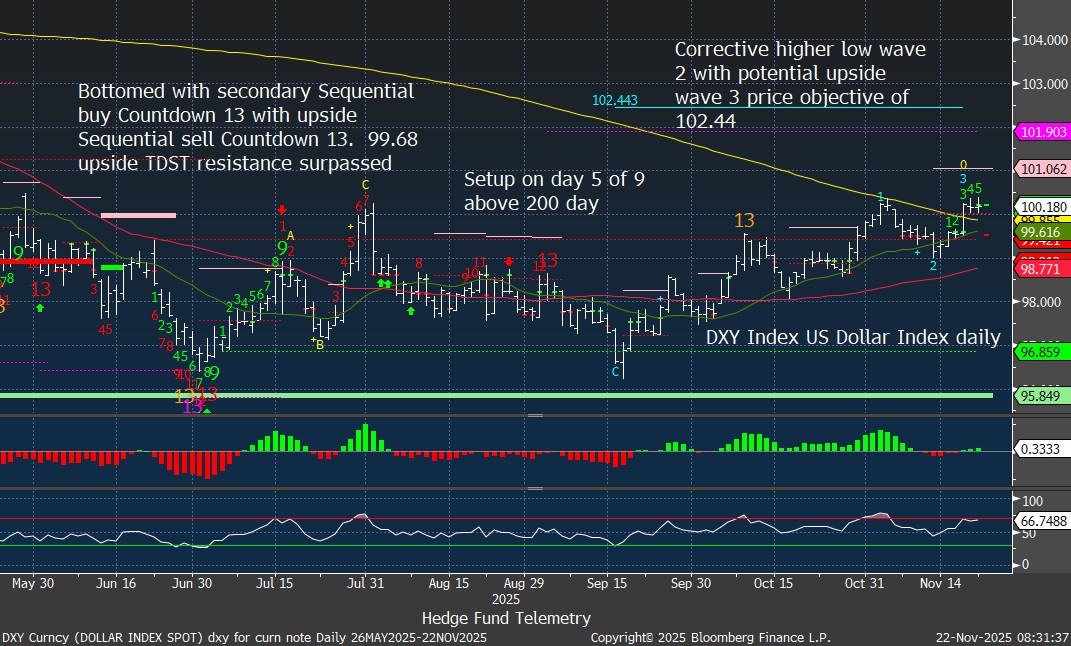 DXY US Dollar Index daily holding above 200 day in upside wave 3 of 5