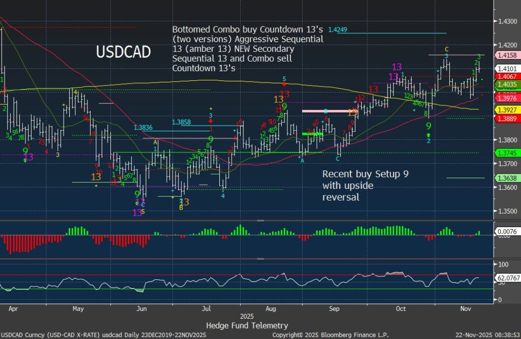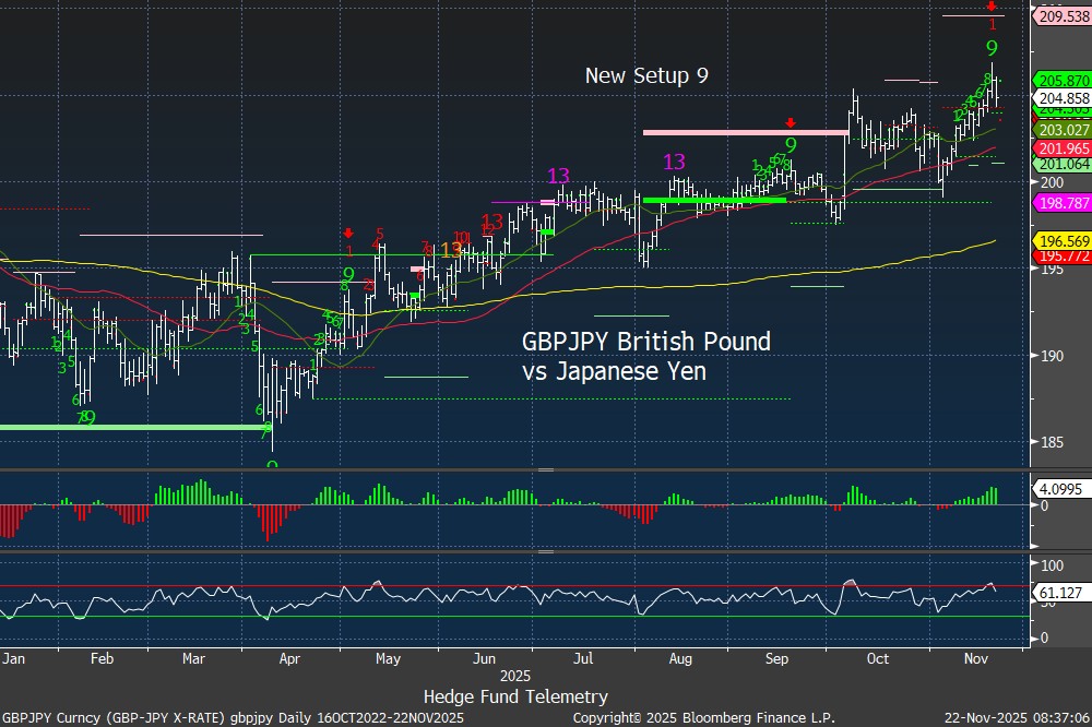 USDJPY Japanese Yen daily with several signals 9’s and 13’s with upside 20 day sloping support