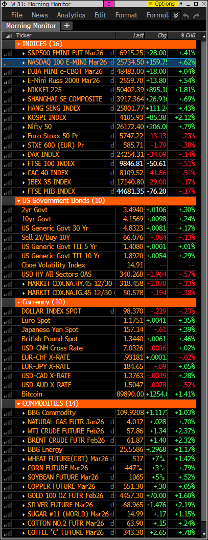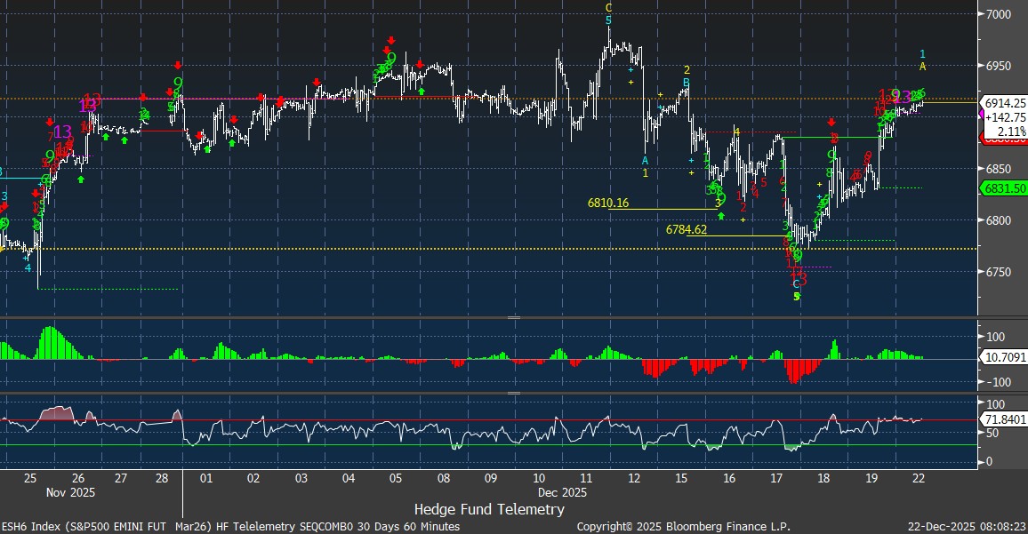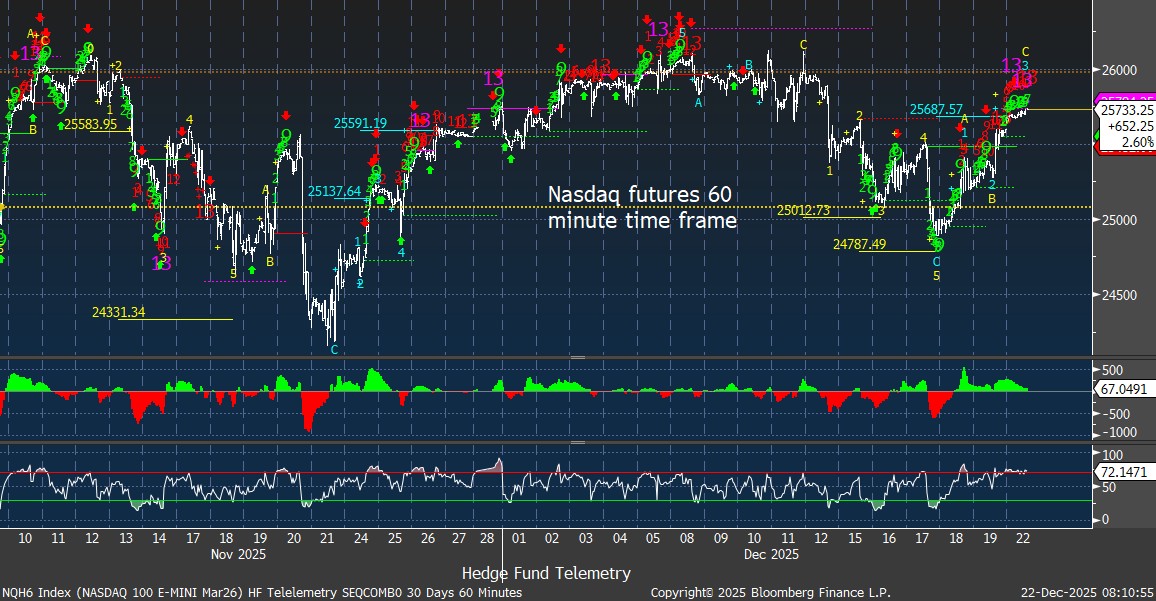Futures are higher to start the week, extending last week’s year-end bid with AI/tech risk-on tone still the dominant factor. S&P and Nasdaq 100 futures are near and could have a new DeMark Sequential sell Countdown 13 today or tomorrow. Asia: Strong across the board (Japan, Korea, Taiwan standout); tech notably firm (semis and AI-linked names led). Europe: Down ~10–15 bps; defensives and rate-sensitive groups weaker while energy/tech/basic resources relatively better. I will be on Maggie Lake’s YouTube channel live at 4 pm today.