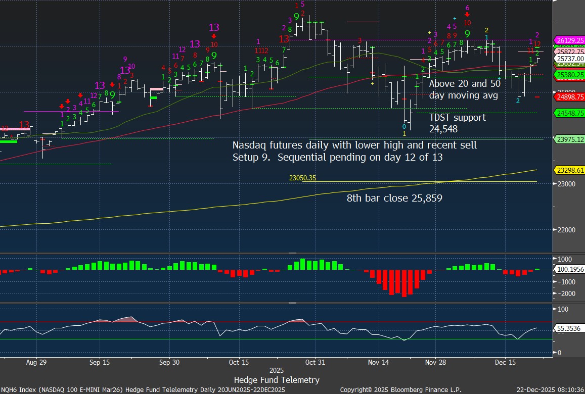 Nasdaq 100 futures daily with Sequential on day 12 of 13. 8th red bar close is 25,859 needed tomorrow or in coming days to qualify the Sequential sell Countdown 13.