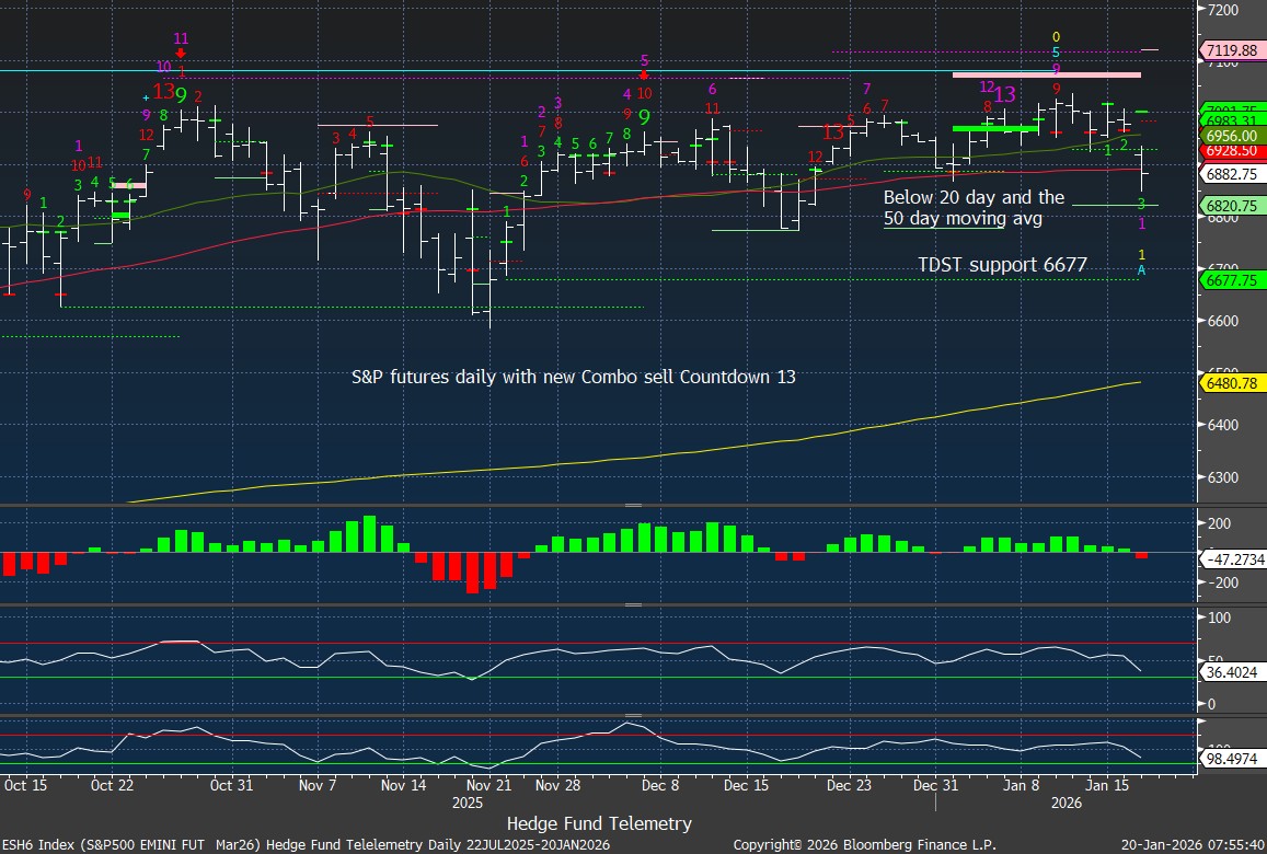 S&P futures daily has been in a rolling pattern in the last 4 months. Just below the 50 day today but off the overnight lows. TDST Setup Trend Support at 6677 could come into play