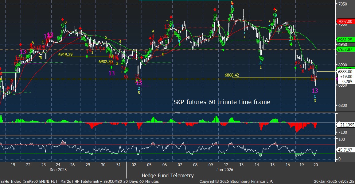 S&P futures 60-minute tactical time frame has both DeMark Sequential and Combo 13’s in downside wave 3 of 5. A corrective lower high wave 4 bounce is possible. Wave 4 would qualify if below wave 2 (yellow 2) and with a 13 bar/hour closing high.