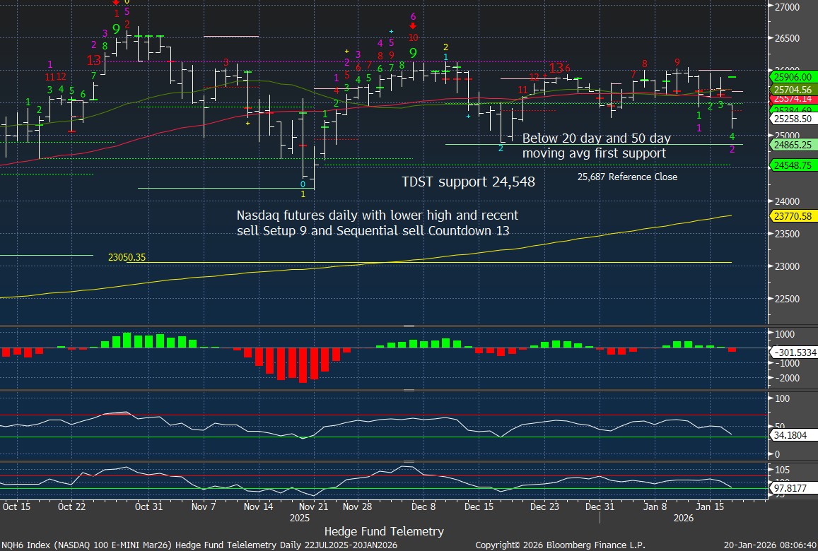 Both indices are significantly lower on today down over 1% with sentiment backing off modestly on Friday (S&P sentiment 64 → –3; Nasdaq 66 → –4). Importantly, the sentiment levels are now below the 20-day moving average, testing trend support.