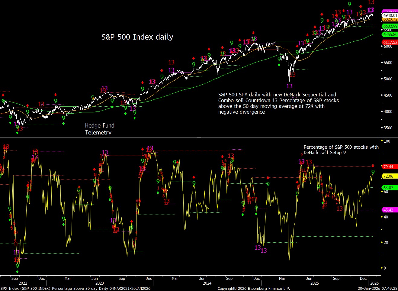 S&P 500 daily with extended view of just Setup 9’s and Sell/Buy Countdown 13’s shown. Recent Sequential and Combo 13’s have seen nominal pullbacks or periods of stalling. The percentage of stocks above the 50-day is elevated at 72% with a new sell Setup 9, which should see a pullback in the number of stocks above the 50-day.