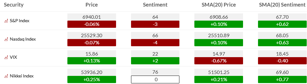 Sentiment remains elevated (75) but flat on the day, with price hugging the 20-day average. This reflects crowded positioning rather than fresh buying.