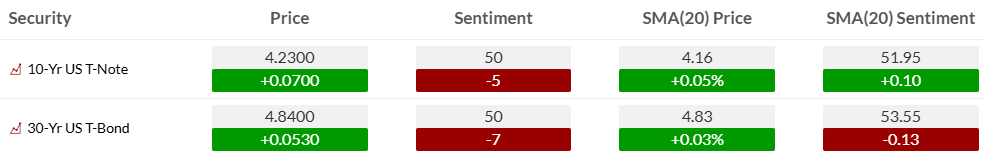 Yields are edging higher, but sentiment is deteriorating (–5 on 10-yr, –7 on 30-yr). Despite that, price remains marginally above 20-day averages, signaling that rate markets are losing bullish momentum without yet breaking trend.