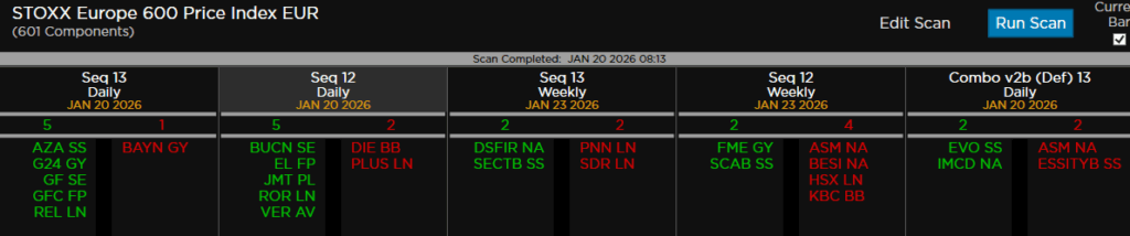 Euro Stoxx 50 with sharp reversal down after recent Combo 13 and sell Setup 9. Below 20 day and above 50 day.