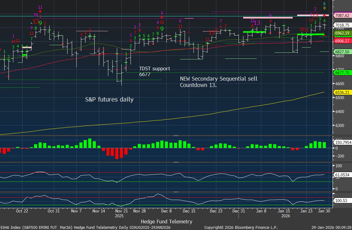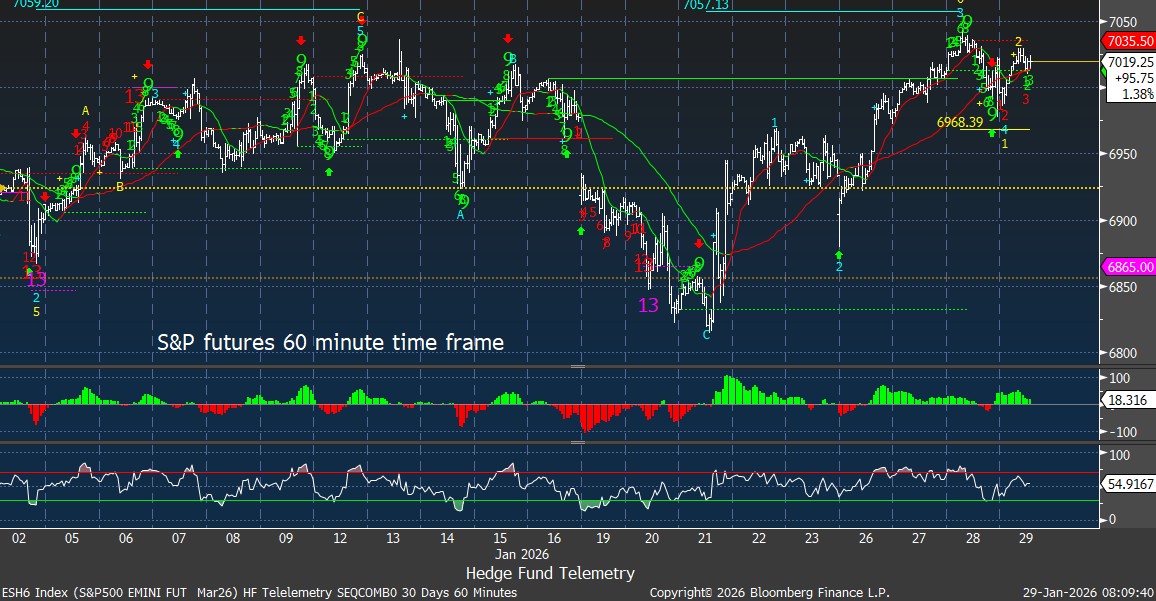S&P futures 60-minute tactical time frame stalled yesterday after the recent move. The bounce might be a corrective lower high wave 2 of 5. There is a downside Sequential pending on hour bar 3 of 13 so let’s see if that develops with lower prices.