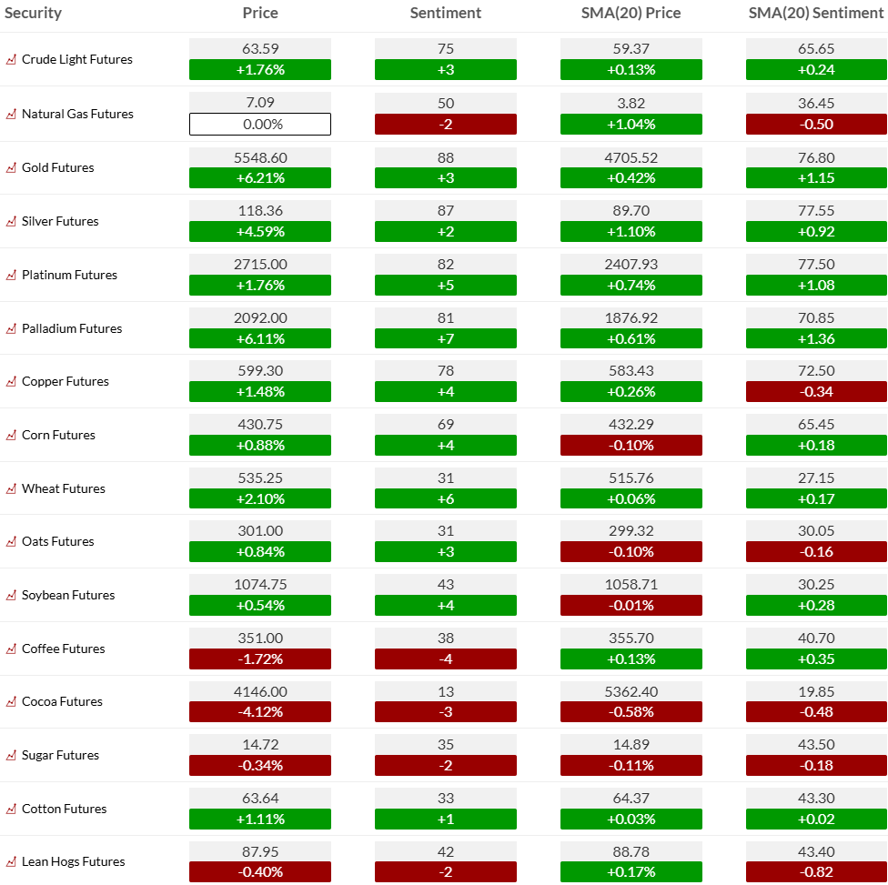 Gold & Silver: sentiment elevated (mid/high-80s) and diverging sharply from 20-day averages → momentum strong, but crowded
